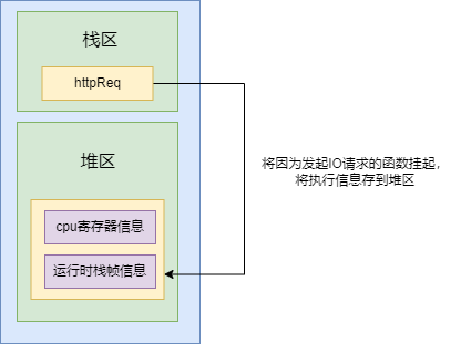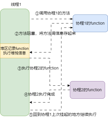 - 协程1代码阻塞,将执行的栈帧信息存到堆区中,挂起该协程。