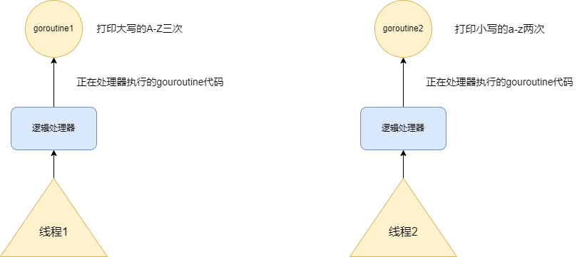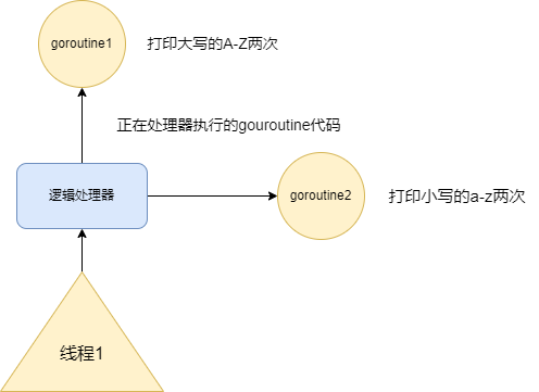 为了更好的理解并发,我们这里给出这样一个例子,我们当前功能会在一个线程上创建两个协程,这两个协程分别打印两次大写的A-Z和小写的a-z。因为仅仅使用一个线程在一个CPU核心上工作,而且打印并不会出现IO阻塞,所以最终我们的输出结果应该是先输出大写的A-Z两次,随后再输出小写的a-z两次。