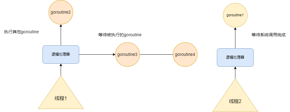 一旦goroutine1系统调用完成,goroutine1就会和线程2逻辑处理器分离,回到线程1的逻辑处理器上等待调度执行。然后线程2的逻辑处理器则继续处理其他的goroutine。