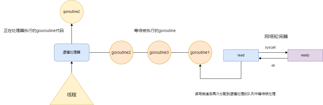 同样的,假如goroutine1执行的是网络IO,那么情况就有些不同的,当goroutine1因为网络IO而发起阻塞时,这个goroutine就会被移动到运行时集成的网络轮询器上,待网络轮询器读或写准备就绪,goroutine1才会再次分配到逻辑处理的队列中等待被处理。