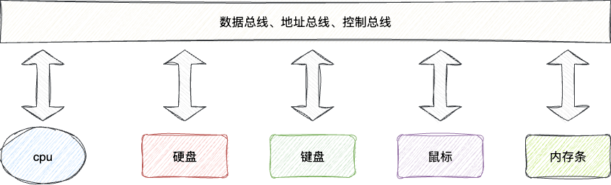 在冯·诺依曼体系的计算机设计理念下,计算机引入了键盘、鼠标、显示器、硬盘等设备协同工作。为了避免多设备协同线路设计的复杂性,所有设备都连接在一条总线上: