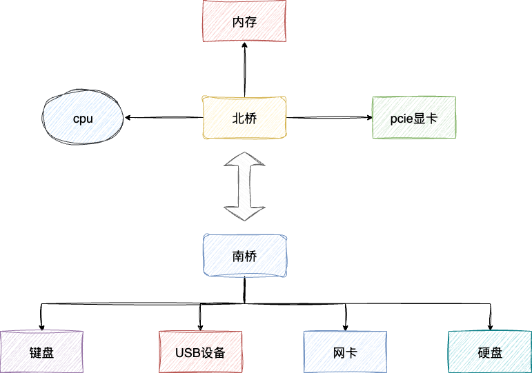 南桥负责处理键盘、网卡、硬盘等相对低速的I/O设备