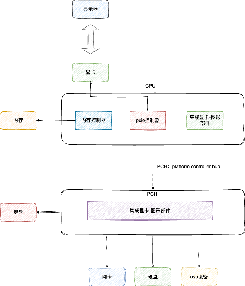 由于只剩下南桥芯片,也就不再区分南北桥了。对应的架构变为下面这样,可以看到内存控制器和显卡(PCIe控制器)都集成到CPU内部。对外的硬件设备在Intel新架构中通过PCH(Platform Controller Hub)取代原有的南桥芯片,负责进行I/O操作和连接外部硬件设备。