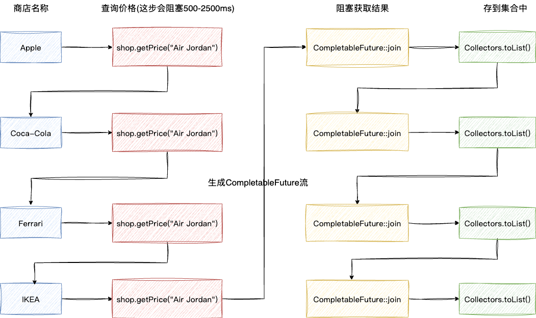 上述我们提到过,之所以慢是因为join阻塞了流的操作,所以提升效率的方式就是不要让join阻塞流的操作。所以笔者将流拆成了两个。 如下图,第一个流负责顺序提交任务,即遍历每一个商家并将查询价格的任务提交出去,期间不阻塞,最终会生成一个CompletableFuture的列表,可以理解为需要获取结果的任务清单。