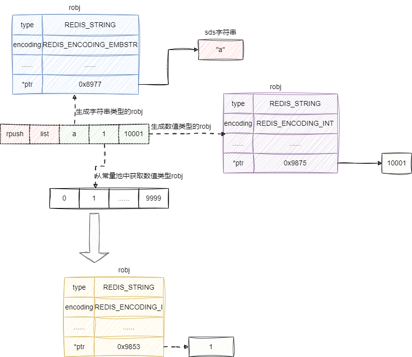 最后我们再给出robj 的创建过程,可以看到它会将外部传入的字符串指针的和字符串长度记录到sdshdr ,然后交由robj 统一记录其类型、编码、sds字符串指针地址: