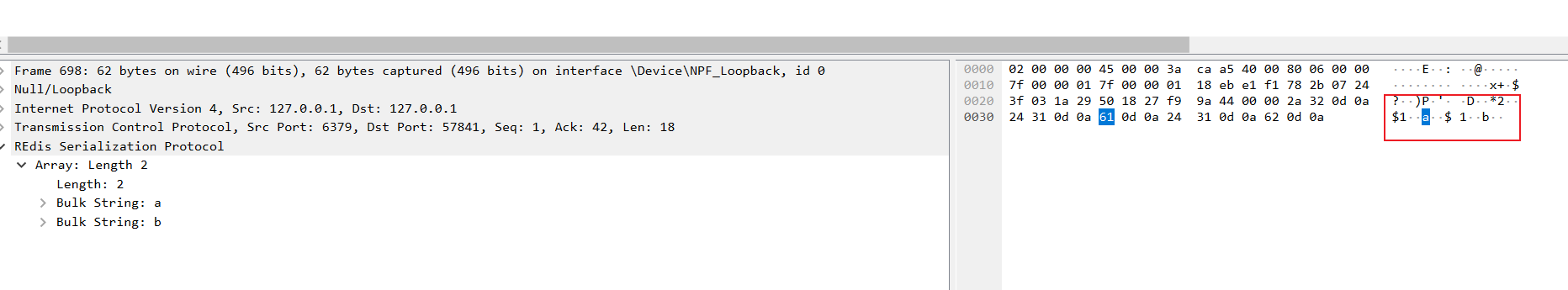 对应的含义为长度为2,第一个元素长度为1值为a,第二个元素长度为1值为b。对应的我们也给出lrange指令的抓包截图: