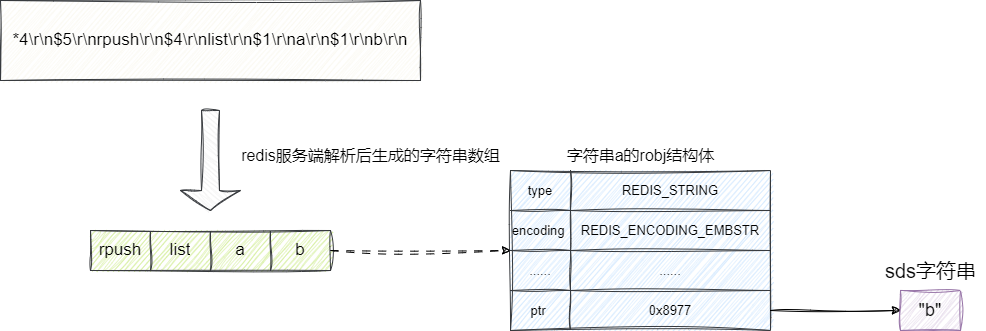 *4表示后面有4个字符串,分别是rpush、list、a、b。$5表示下一行的字符串长度为5,redis解析时只需换行后截取5个长度即得到rpush。rpush后面跟着一个$4意味着rpush之后跟着的字符串长度为4即list,后续a、b同理这里不多做赘述。