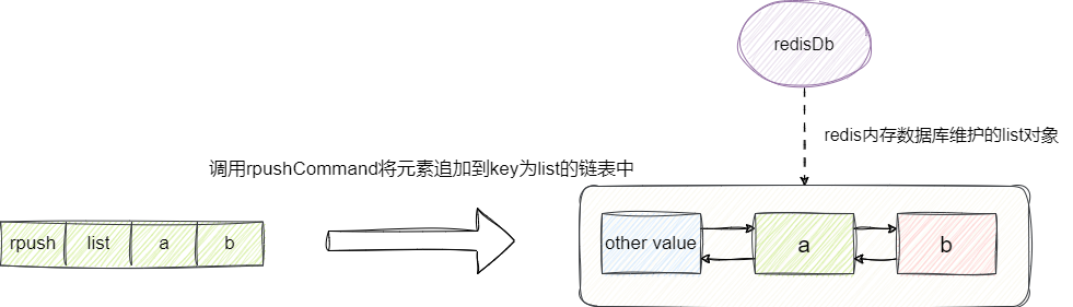 通过上文的步骤我们得到的实际的字符串数组,随后redis会根据数组0得到指令字符串为rpush,由此走到rpushCommand将传入的元素值a、b追加到链表末尾:
