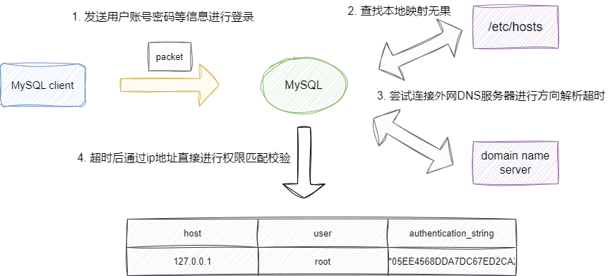 IP地址。 MySQL服务得到用户IP、账户、密码进行权限校验。- 考虑到某些用户是通过域名进行配置的,于是服务器会主动通过