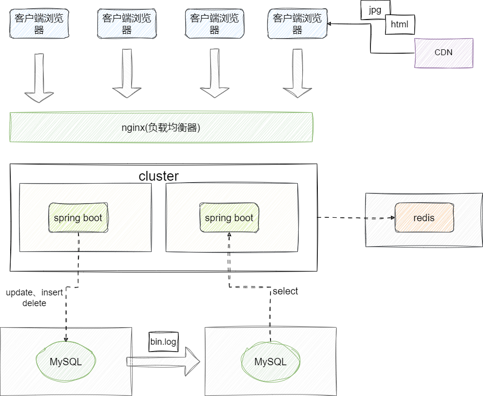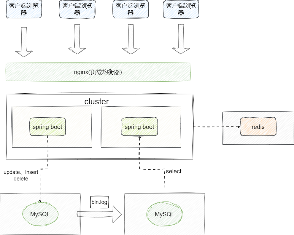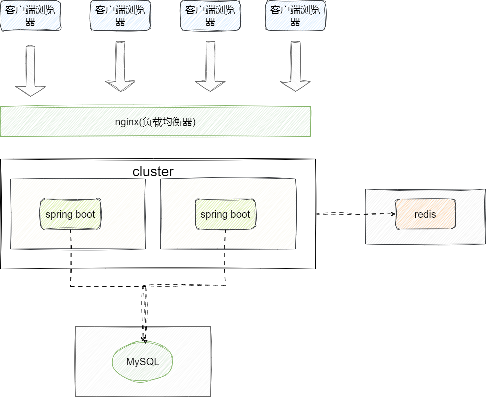 如下图可以看到,本次架构本质上是通过横向拓展的方式让负载均衡器通过负载均衡算法将请求分散到不同的应用服务器上,借着负载均衡器,我们还可以针对系统整体做流控、鉴权、反向代理等统一请求管理,保证系统整体安全和稳定: