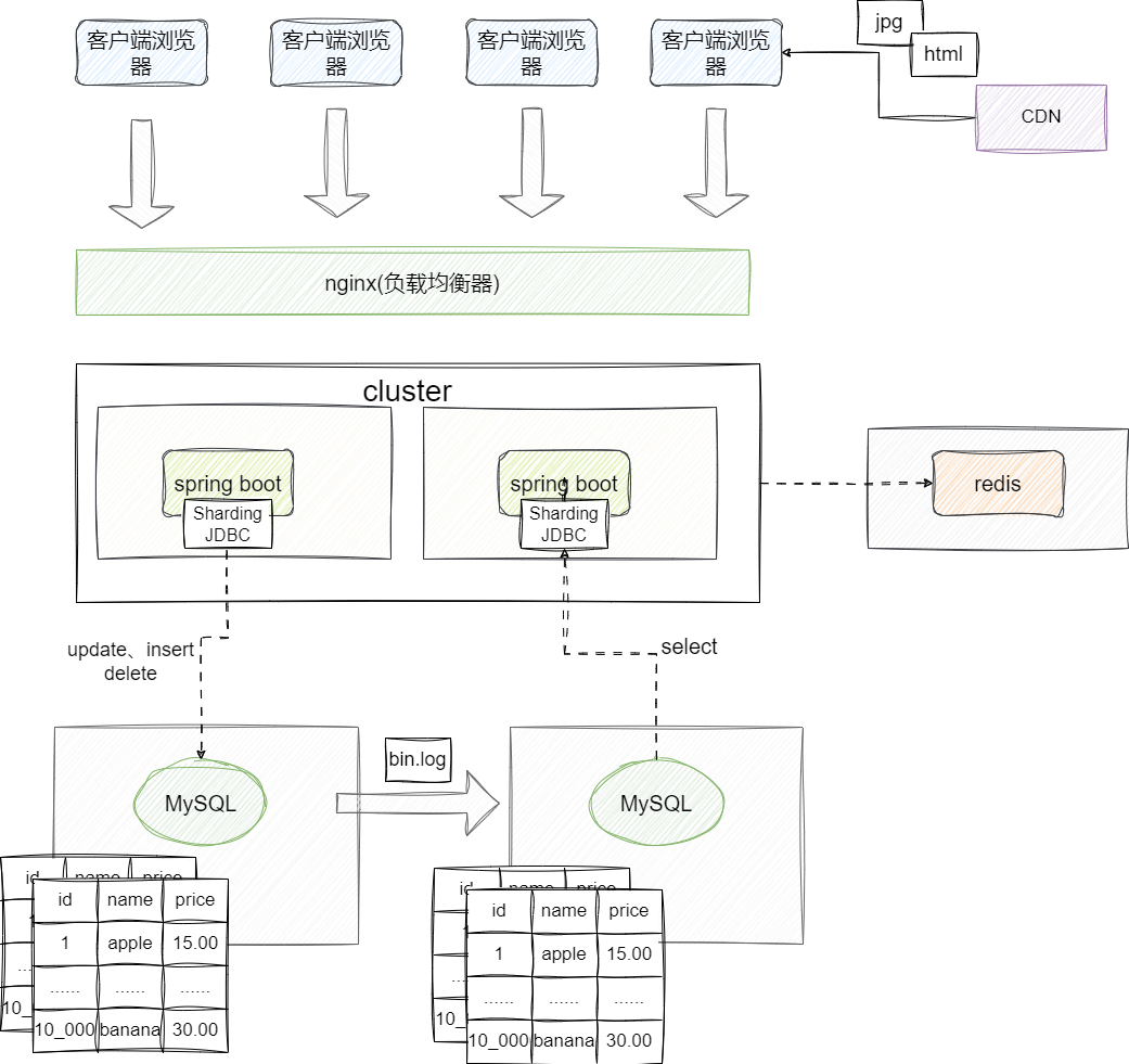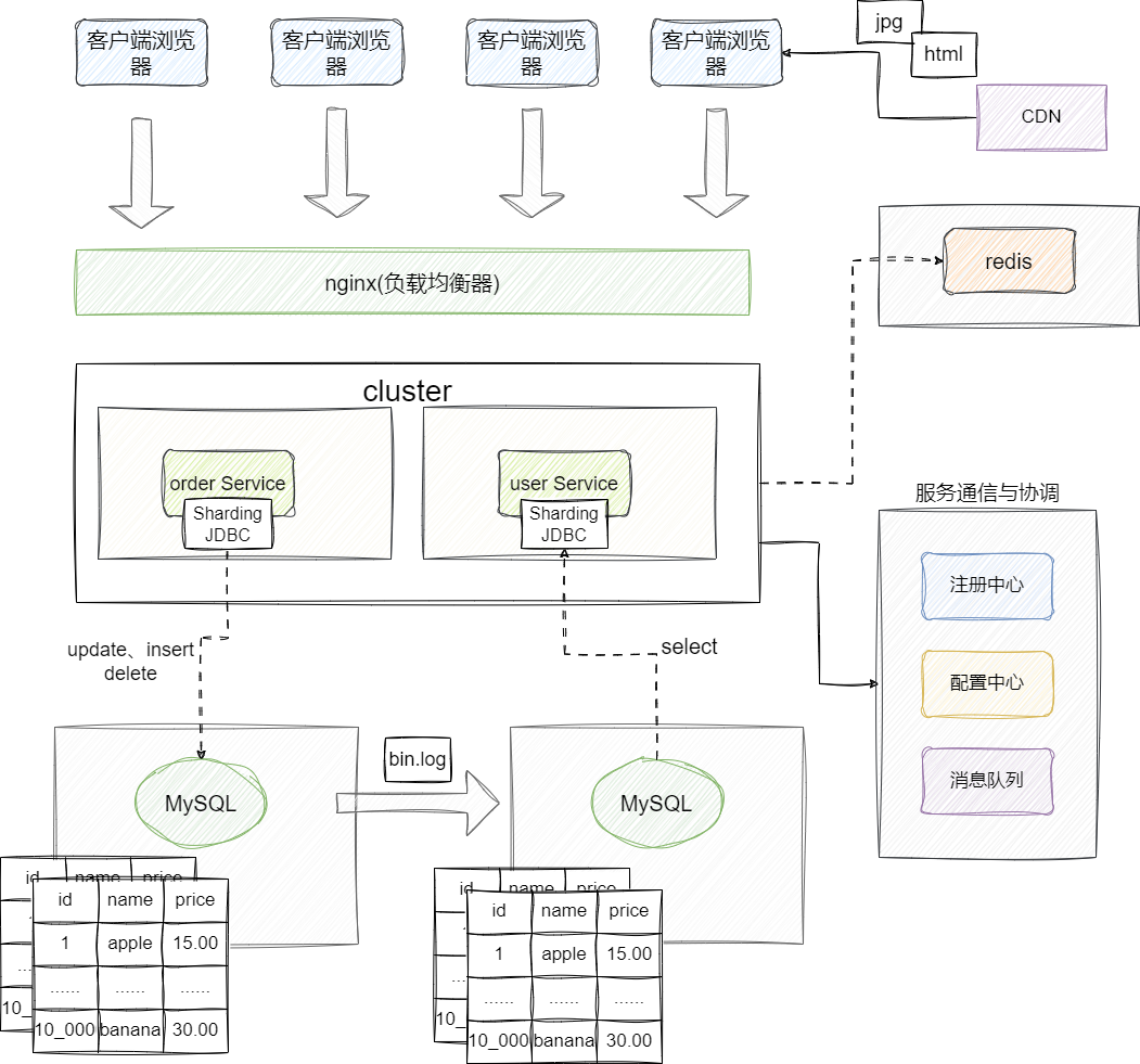 我们通过缓存中间件解决了热点数据问题,但是缓存中间件的容量毕竟是有限的,对于非热点数据我们还是需要通过数据库进行统一维护管理为了避免数据库写操作(update、insert、delete)阻塞其他事务读操作(select),因为现代主流系统架构基本都是读多写少的,所以我们更倾向于引入读写分离的方案,即让所有写操作都都面向master服务器,而读操作都通过slave服务器完成,slave通过订阅master库的bin.log进行数据实时同步操作。