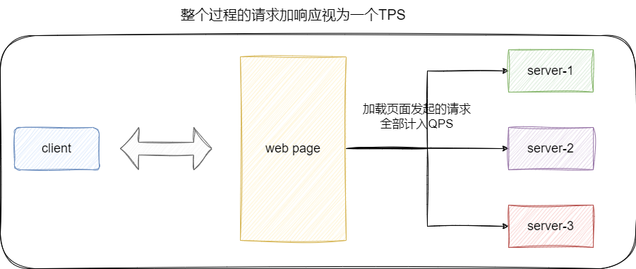 例如我们现在有个web页面,当用户打开到完全加载查看到页面内容时,这就可以理解为1个TPS,而这个页面中所有请求的接口就应该计入QPS中。