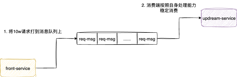 在明确上述方案无果后,我们就需要针对流量进行整顿了,最常见的手段就是将流量削减平整,保证上游服务能够准确处理该流量,结合目前的主流方案也就是添加一个可靠消息中间件,这也就是我们常说的削峰填谷: