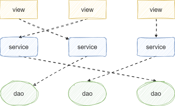 - 这也是最为严重的一点,单体架构随着业务的拓展,按照用户展示层、业务逻辑层、数据访问层这种模式进行分层逻辑,在业务不断迭代之后,系统调用会构成下图所示的网状结构,在水平方向上来看确实比较精简,但是从垂直的角度来看,各层之间相互错中复杂的调用,导致各层都会存在依赖一个或者多个模块的情况,这对于后续的功能复用、维护、甚至是不同模块间的技术栈升级都是异常困难的。