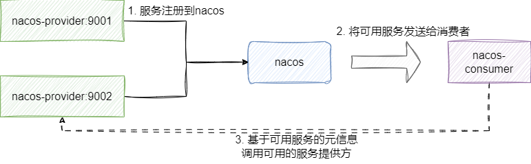 这里我们先简单介绍的一下项目的架构,笔者将基于Nacos的源码搭建一套基础的服务注册中心,然后提供两个nacos-provider服务作为服务提供者(端口号分别是9001和9002),而nacos-consumer作为服务消费者通过nacos或者nacos-provider的信息发起服务调用。