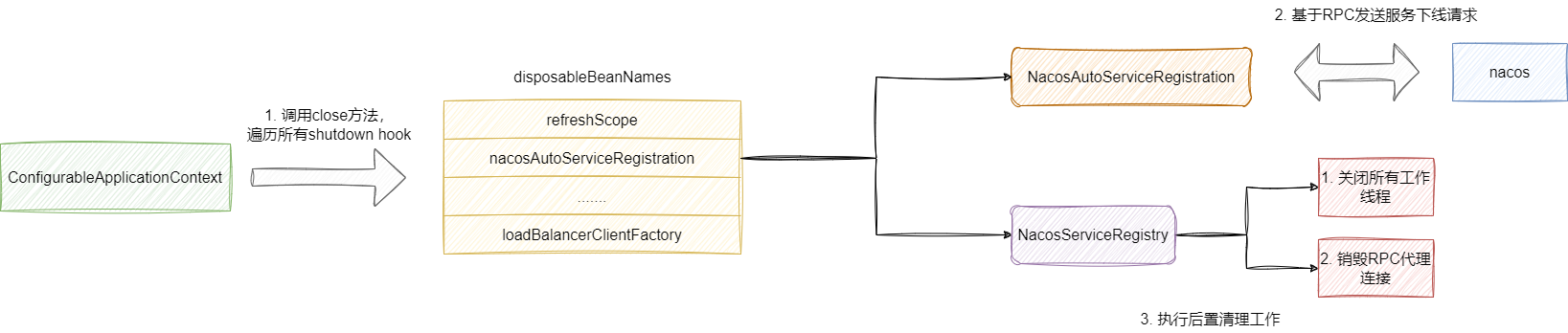 Spring上下文close方法执行关闭操作,此时spring就会遍历所有的虚拟机钩子即shutdown hook,对应我们的服务提供者在启动时注册的shutdown Hook即NacosAutoServiceRegistration的close方法就会发起服务下线请求,一旦完成服务下线请求通知之后,服务提供者就会销毁RPC连接以及所有工作线程: