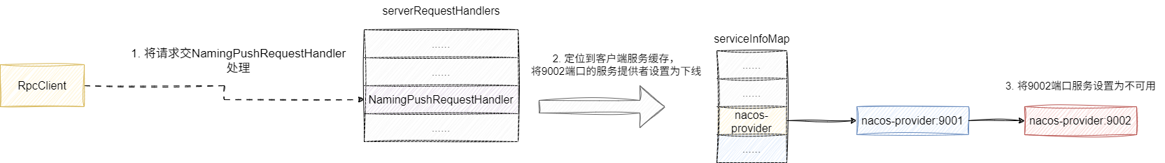 服务消费者RpcClient收到该请求后,会基于请求类型定位到服务端请求处理器,以我们下线通知为例就是NamingPushRequestHandler,由该处理器更新客户端中记录9002端口号的服务提供者nacos-provider状态更新为下线,后续服务消费者看到缓存中记录的提供不可用时就会调用9001端口号的nacos-provider: