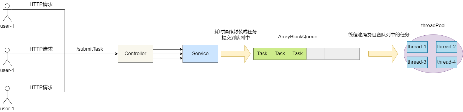 简单来说生产者消费者模型就是让多线程去异步消费生产者的任务,对于web开发而言,我们的生产者可以是任意的HTTP请求,这些HTTP请求会将一些耗时操作提交到队列中让消费者进行消费(这里消费者可以是一个异步的线程或者线程池,具体看读者的业务场景) 所以我们的实现思路如下:
