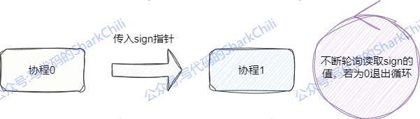 举个共享内存的例子,我们现在有两个协程进行通信,协程1传到数字0时结束工作,按照共享内存的套路,我们会给协程1传入数字类型的指针,让协程1去轮询这个指针值的变化,直到数字变为1: