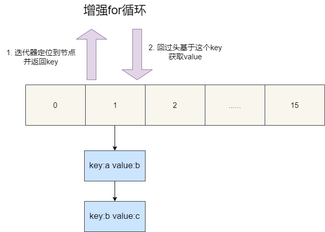 以下图为例,假设我们要获取key为b的value,这就意味着,我们迭代keySet时经过了a,b,在获取value时要需要根据key定位到索引1的位置,再经过一次a节点找到key为b的节点,自此我们也就直到了为什么使用keySet定位k-v效率低下的原因了。