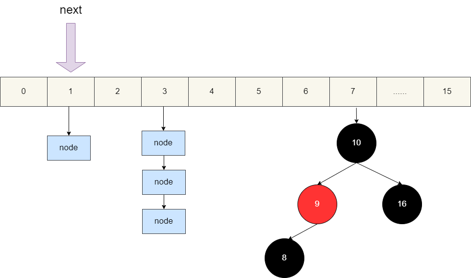 而这个迭代器是继承自HashIterator,所以进行初始化时,实际上还是调用HashIterator的构造方法。 我们都知道HashMap底层的实现是数组+链表/红黑树,所以在进行key的迭代器生成时,它会通过遍历找到数组中第一个不为空的位置,并让next指针指向这个元素:
