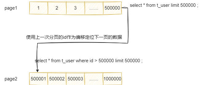 这里需要注意一点,因为我们分页查询面对的是百万级别的数据,所以随着分页的推进势必出现深分页导致查询效率势降低,所以为了提高分页查询的效率,我们可以利用查询数据有序的特性,通过id作为偏移进行分页查询。