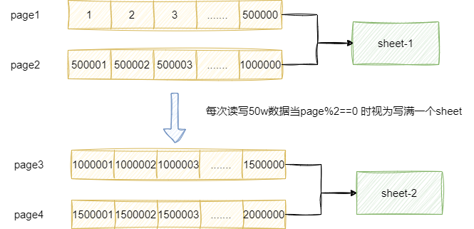 方案1是采用分页查询的方式进行查询,参考自己堆内存的配置推算每次分页查询的数据量。因为问题1采用了分页查询,我们完全可以通过分页查询的次数推算出一个sheet写入了多少数据,例如我们每次分页查询50w的数据,那么每两次就可以视为一个sheet写满了,我们就可以创建一个新的sheet写入数据。