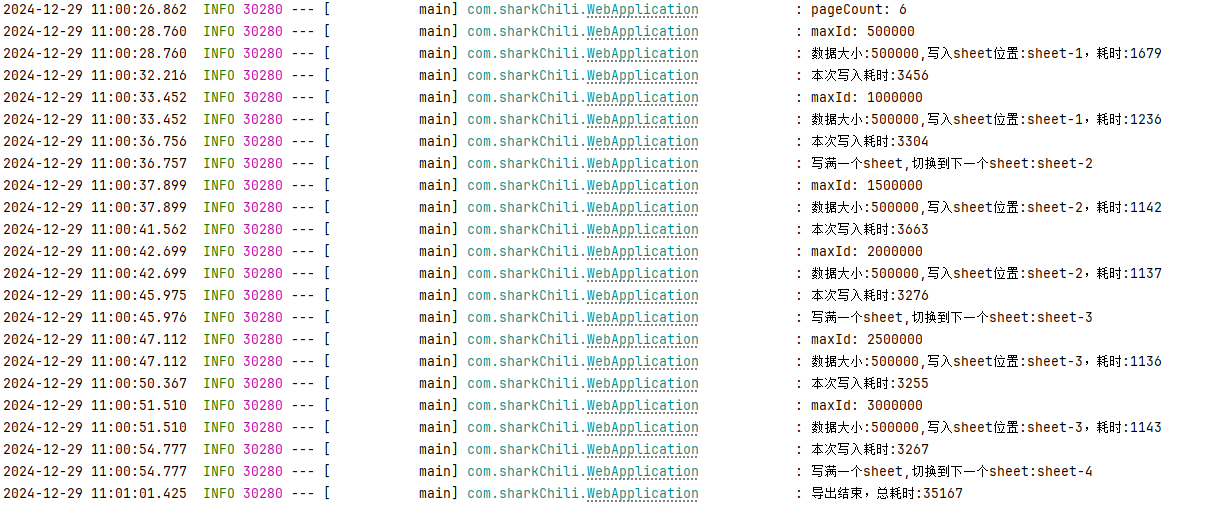 可能会有读者好奇笔者这个50w的数值设计思路是什么,除了考虑避免OOM以外,还考虑到每个sheet只能写入100w条的数据,为了方便通过分页查询的轮次确定当前写入的数据量大小,笔者尝试过20w、50w。