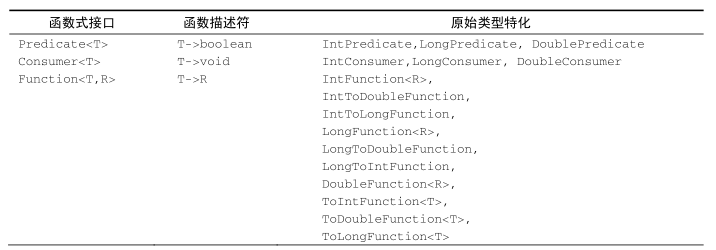 基于上述三大函数式接口延申很多特殊类型的接口,读者可自行参阅,这里笔者就简单介绍一下原始类型特化的函数式接口,它是Java 8为我们前面所说的函数式接口带来了一个专门的版本,以便在输入和输出都是原始类型时避免自动装箱的操作: