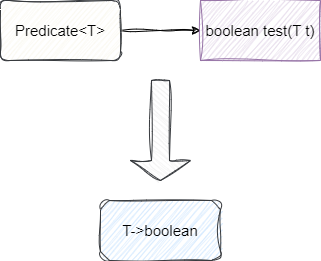 为了实现抽象行为却要声明如此繁重的语句显得Java这门语言非常笨重,接下来我们就不妨一步步实现将函数式接口Predicate精简为lambda语法,首先我们根据Predicate的抽象接口得出,它要求传入一个T类型,以我们的代码为例就是String类型,返回一个Boolean类型的值,所以我们可以得出这个函数式接口的描述符为T->boolean,对应我们的例子就是String->boolean: