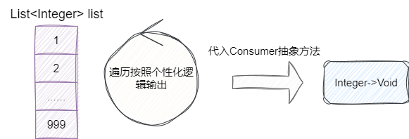 这里笔者直接给出思路,按照需求说明,我们要求传入一个整数的list进行遍历,但是遍历后针对每一个元素进行个性化逻辑输出,由此得出这个需求要求的可变行为是Integer->Void,