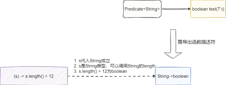 我们一直提到一个类型推断的概念,它是编译器能够识别我们的lambda表达式并代入到函数式接口只执行的根本原因,我们还是以上文Predicate<String>接口对应的(s) -> s.length() > 12;介绍一下类型推断的过程。