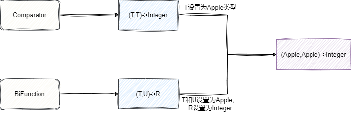 如下代码所示,根据上文的介绍我们都知道Comparator接口的函数签名为(T,T)->Integer,对应我们的Apple比较器则是(Apple,Apple)->Integer,同理BiFunction对应的抽象方法为R apply(T t, U u);,由此我们得出它的签名为(T,U)->R,很明显我们把T和U的类型都设置为Apple,而R类型设置为Integer,那么这两个函数式接口的函数描述符就是一致的,这时候我们同样的表达式就可以应用于两个函数式接口了: