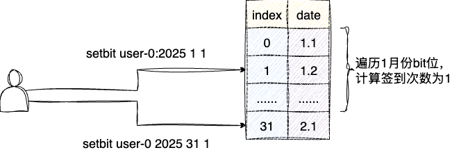 1. 添加用户签到接口,通过jedis客户端setbit指令维护用户签到信息,对应key为用户名:年份,例如:user-0在2026.1.1号签到,对应指令则是setbit user-0:2026 0 1