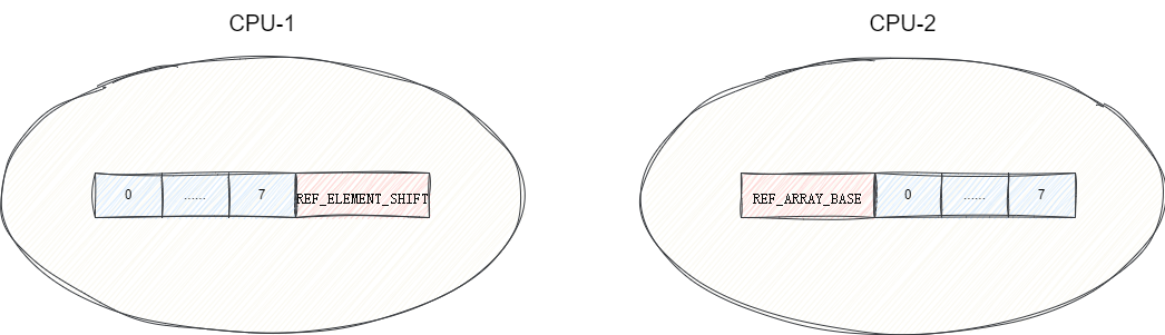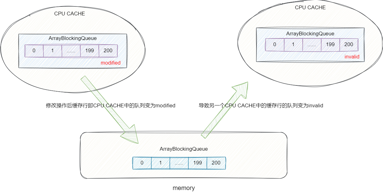 除此之外JDK自带的ArrayBlockingQueue也没有考虑到并发场景下的伪共享问题,例如每个线程对应的CPU核心都将内存中的ArrayBlockingQueue加载到缓存行中,为了保证双方的缓存一致性,一旦一端修改了ArrayBlockingQueue,那么另一端的ArrayBlockingQueue就会被视为脏数据,这就意味着另一端的CPU需要操作ArrayBlockingQueue就需要重新从内存加载一份全新的ArrayBlockingQueue才能进行更新操作,在并发激烈的场景下,这种情况操作效率大大降低:
