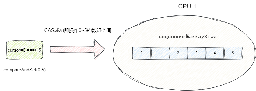 //基于CAS原子更新cursor的数值,若成功则说明可以操作从current 到next这个范围的序列号的对应的数组元素空间,后续可以基于这个范围进行消息投递操作