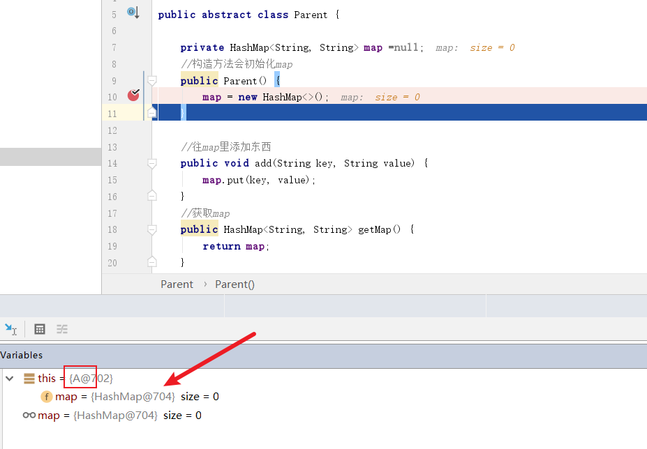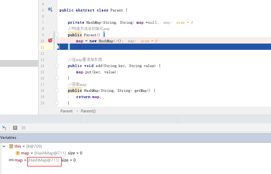 使用多线程模式进行调试时可以发现每一个自类都会走到父类的构造方法初始化一个父类,这就意味着彼此的map都是独立的,所以不存在线程安全问题。