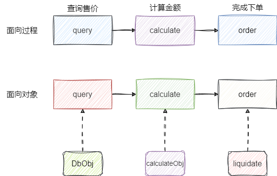 面向过程更多强调的是功能上的实现,将问题拆解成子步骤,然后针对要实现的步骤点进行逐个实现,并依次调用,不考虑复用等问题。