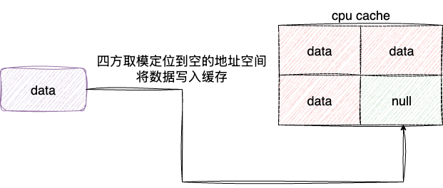 因此设计者考虑采用数据取模地址并写入的设计思路,但是问题又来了,如果两个要写入的数据地址发生冲突要如何解决?于是设计者打算将缓存空间分为四块,也就是四路组相连。在进行缓存写入时,对四个缓存空间都进行取模运算,将数据写入有空闲空间的缓存块中,这样既能保证写入效率,又能尽可能减少冲突: