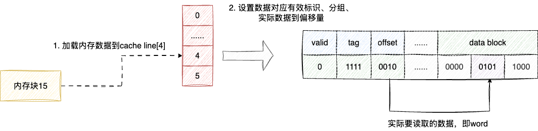 tag标识说明cache line对应的内存数据是内存块15 offset告知cache line中对应的偏移地址是我们实际要用到数据,这样的数据用专业术语称为字(word)