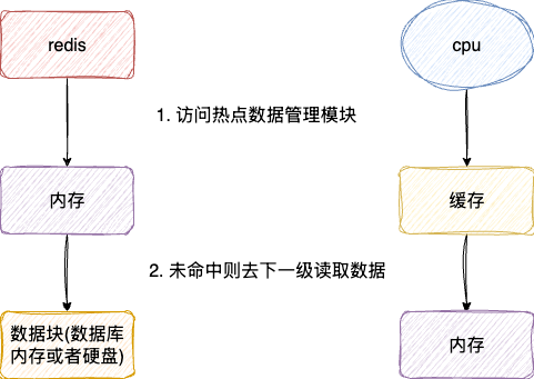 在CPU访问数据的时候,都会优先从缓存中获取数据,如果没有找到再去内存中读取,若内存中也找不到,则从磁盘中读取数据并加载到CPU CACHE中。