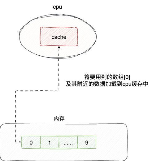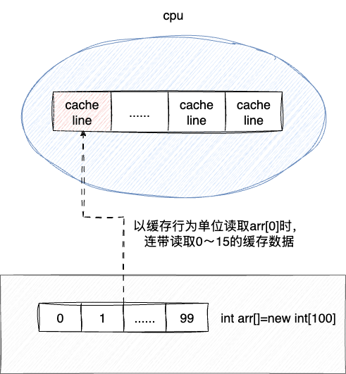 这64字节是什么概念呢?我们都知道一个整型变量是4个字节。假如我们声明一个数组int data[] = new int[32768];,当CPU cache载入data[0]时,由于cache line的大小为64字节,也就是说还会有一些空闲的空间没用到,根据局部性原理,CPU就会将剩余部分用于存储data[0]附近的数据,也就是说载入data[0]时,cache line顺手将索引1-15的元素也加载到CPU cache line中.