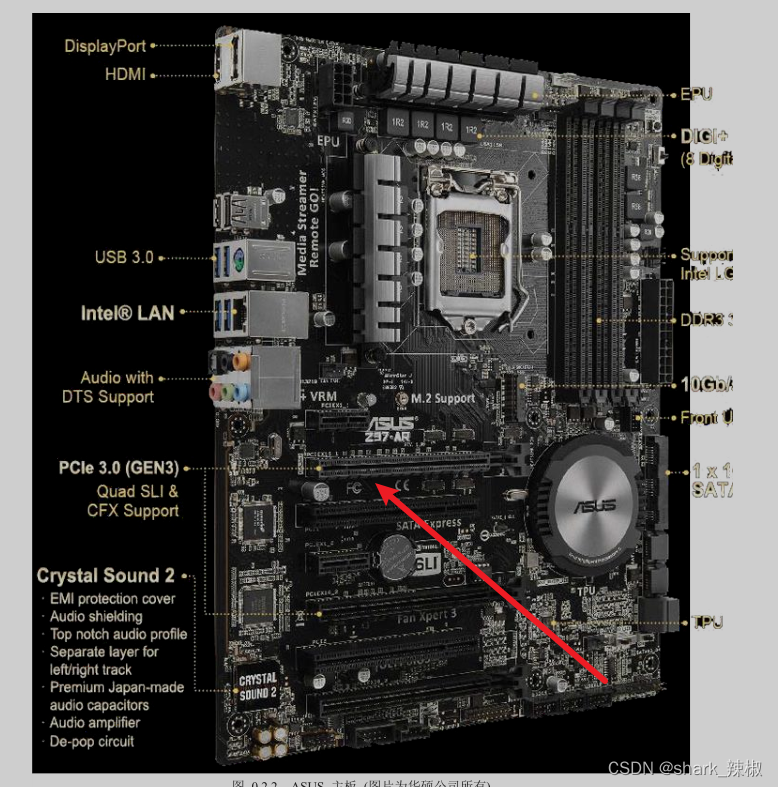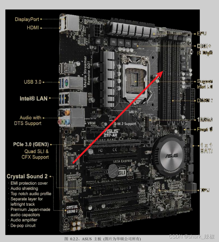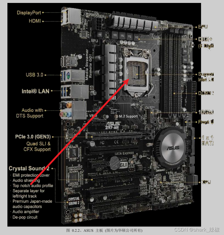 以华硕主机来聊聊CPU这个东西,下图所指的位置就是CPU的插槽,使用不同的指令集CPU的执行效率都会有所不同。但在同款CPU性能比较下,频率也是CPU性能的一个重要指标,例如一个CPU的执行频率为 3.6GHz,这就代表着这个CPU理论上一秒可以执行36亿个指令(3.6 10001000*1000 =36亿)。