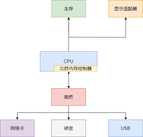 早期的主板会将结构分为南北桥两个部分,北桥负责桥接各种读取速度快的组件间的交互,例如主存、CPU、显示适配器等。而南桥负责桥接较慢的装置接口,例如硬盘、网络卡、USB等。