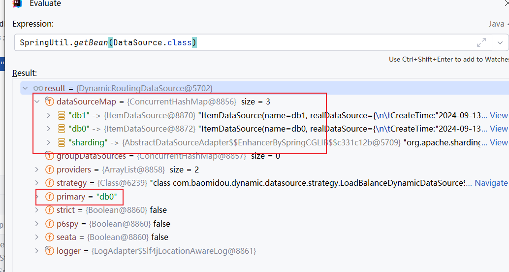 完成上述配置后,我们可以在程序启动成功后看到所有数据源都归整为1个,并且dynamic和shardingsphere的数据源也都存在于数据源中: