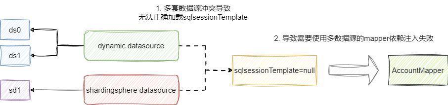 以笔者配置的实验为例,对应AccountMapper需要使用dynamic多数据源下的某个数据源,而当前我们却注入了两套数据源,最终导致AccountMapper这个bean注入失败,导致程序无法正常启动。
