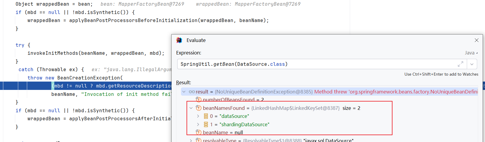 这里笔者也贴出排查过程中,Spring容器的情况,可以看到在抛出异常时,容器中存在两套数据源,导致AccountMapper在进行bean创建时无法得到正确的sqlsessionTemplate,进而导致Error creating bean with name 'accountMapper' defined in file 的错误: