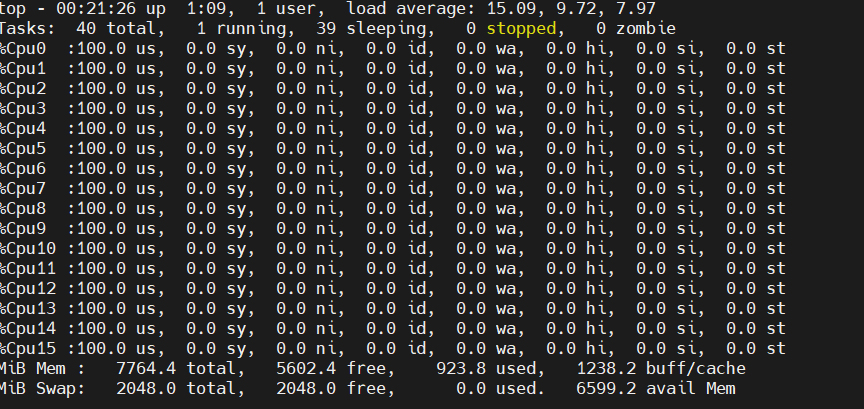 top - 00:21:38 up 1:09, 1 user, load average: 17.69, 10.45, 8.23