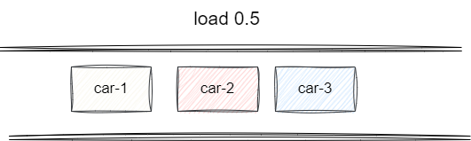 这里补充一下负载的概念,在单核情况下,负载的值为在0~1之间,这就意味着当前cpu还未满载,用一个比较通俗的比喻,假如单核CPU的负载值为0.5,这就意味着单条车道上有一半的车流经过,还可以容纳一半的车驶入: