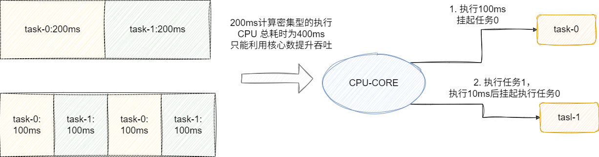 操作系统在这其中唯一能做的,也就是为了避免任务饥饿在某个任务执行100ms时将其切换,执行另外一个任务,但是两个任务总的耗时永远是400ms,且必须在CPU上执行完成,所以即使设置再多的线程也没有任何意义: